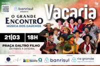 O município de Vacaria será o palco da próxima apresentação do espetáculo O Grande Encontro - Música dos Gaúchos, no próximo sábado (21), às 18h, na Praça Daltro Filho, em frente à Catedral Nossa Senhora da Oliveira. O evento gratuito irá reunir artistas consagrados da música regional, como Renato Borguetti, Elton Saldanha, César Oliveira e Rogério Melo, Shana Müller, Marcello Caminha, Cristiano Quevedo e Analise Severo, entre outros.