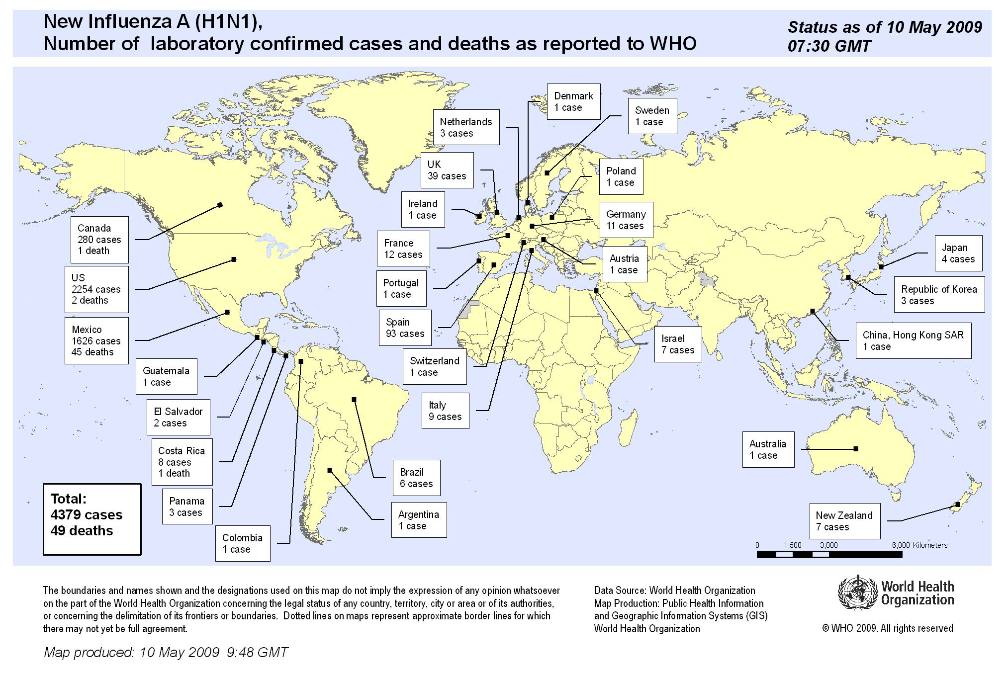 A Organização Mundial da Saúde divulgou no dia 10.05 o mapa que demonstra todos os casos confirmados da Influenza (H1N1) no mundo. Confira o mapa abaixo.