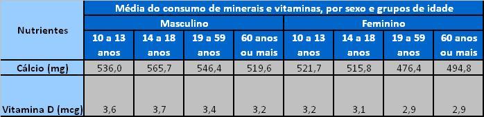 Para as análises, a POF considerou a recomendação nutricional para ingestão de cálcio valores entre 800mg a até 1100 mg, dependendo da idade e sexo. Já em relação à Vitamina D, a pesquisa contemplou a necessidade de 10,0 mcg em todas as faixas etárias.