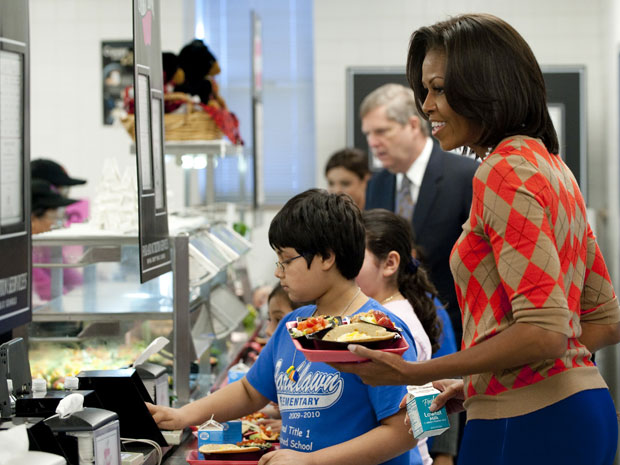 Michelle Obama, primeira-dama dos EUA, monta um prato saudável em visita à cantina de uma escola no estado da Virgínia (Foto: AFP Photo - Saul Loeb)