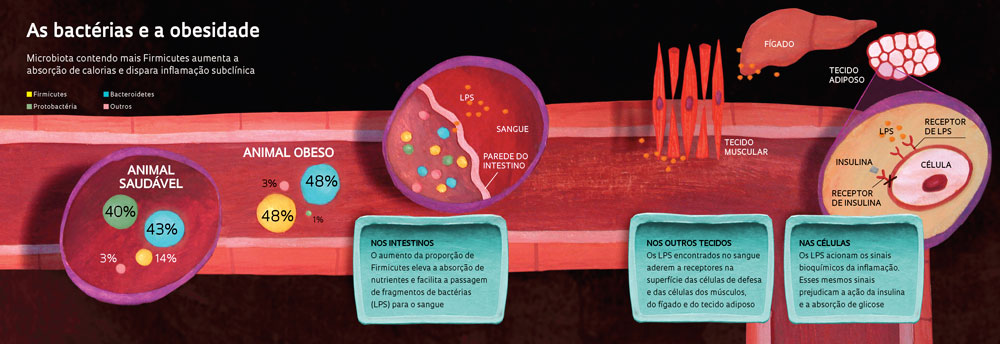 “A microbiota intestinal não é a única causa do diabetes e da obesidade, nem provavelmente a mais importante”, comenta Saad. “Mas constatamos que ela contribui para gerar uma inflamação no tecido adiposo que inicia um processo de ganho anormal de peso que depois se perpetua”, explica o pesquisador, cujo grupo identificou anos atrás que essa inflamação altera o funcionamento da região cerebral que controla a fome e a saciedade (ver Pesquisa FAPESP n° 140).