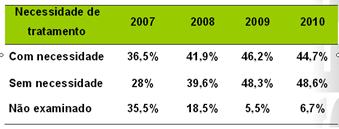 Os profissionais que conduzem as atividades de promoção de saúde junto às escolas participantes do Sorrindo para o Futuro identificaram que 44,7% dos escolares apresentam necessidade de tratamento odontológico. Outro dado significativo é a diferença no índice de necessidade de tratamento entre as Zonas Rural e Urbana: 56,6% na Zona Rural; e 42% nas escolas de Zona Urbana.