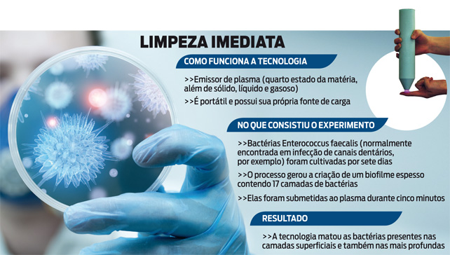 Nos testes feitos em laboratório, a tecnologia conseguiu eliminar as bactérias Enterococcus faecalis (comum nas infecções de canais dentários, por exemplo) que compunham um biofilme espesso. Havia 17 camadas com os micro-organismos, mas apenas cinco minutos de exposição ao plasma foram suficientes para exterminá-los. “Na pesquisa, usamos um exemplo extremo para demonstrar que o aparelho pode ser efetivo”, explicou Kostya Ostrikov, coordenador da experiência. “Para um menor número de bactérias, a inativação pode ocorrer em questão de segundos”, complementou.