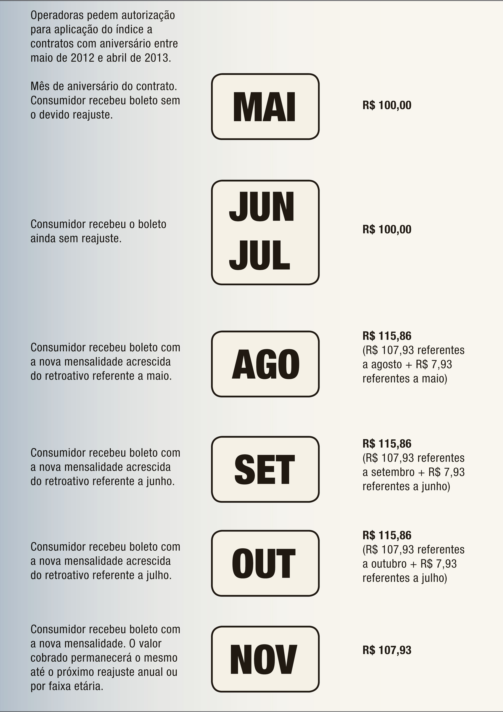 Veja abaixo exemplo de reajuste de um plano de saúde com aniversário em maio e com mensalidade de R$100,00: