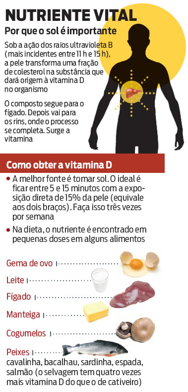 Há várias hipóteses para justificar a carência. Questiona-se até o papel dos genes, que determinariam a capacidade de retenção do nutriente pelo corpo. Uma das causas envolvidas nessa perda é a diminuição do tempo de exposição ao sol observada nas últimas décadas. Em parte, isso se deve às campanhas de prevenção do câncer de pele. Mas essa redução, desejável contra o câncer, acaba interferindo na sintetização da vitamina D no corpo. São os raios ultravioleta B que dão início à produção do nutriente. Basta expor cerca de 15% da pele três vezes por semana por cinco a 15 minutos.