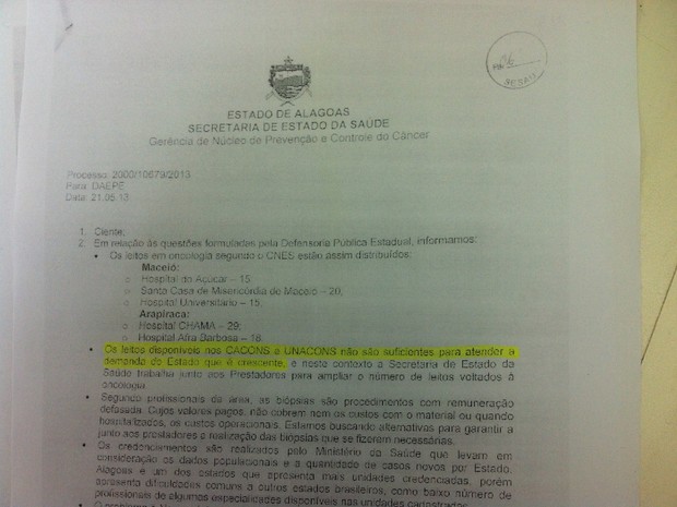 No documento obtido pela reportagem do G1, o Estado alega que os Cacons e as Unacons [Unidades de Assistência de Alta Complexidade em Oncologia] de Alagoas “não são suficientes para atender a demanda do Estado, que é crescente”.