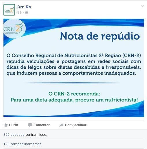 A entidade publicou a nota em sua página no Facebook classificando como "descabidas e irresponsáveis" as dicas de leigos sobre dietas.