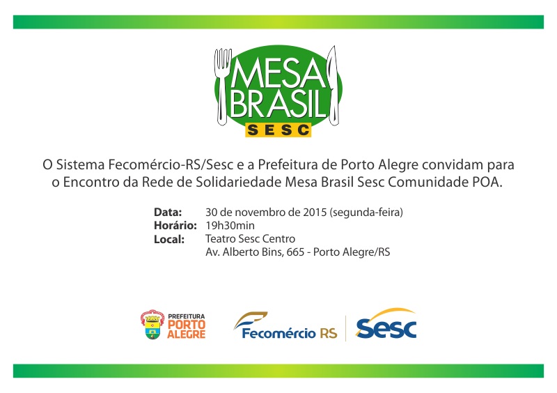 O Programa Mesa Brasil Sesc realiza hoje (30/11), o Encontro da Rede de Solidariedade, em Porto Alegre. Empresas doadoras, entidades sociais beneficiadas, voluntários e parceiros se reúnem a partir das 19h30, no Teatro do Sesc Centro (Av. Alberto Bins, 665), para conferir a apresentação do balanço das atividades realizadas na Capital e Região Metropolitana durante este ano.