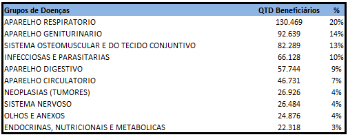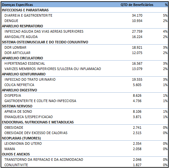 Foram analisados os dados de 652.697 beneficiárias do sexo feminino, ao longo de 2015. 20% acionaram o plano de saúde em decorrência de doenças respiratórias (principalmente amigdalite e infecção aguda das vias aéreas superiores); 14% por causa de doenças no aparelho geniturinário (em sua maioria cólica nefrética e infecção urinária); 13% devido a patologias no sistema osteomuscular e do tecido conjuntivo (dor articular e dor lombar); e 10% decorrentes de doenças infecciosas e parasitárias (dengue, diarreia e gastroenterite).