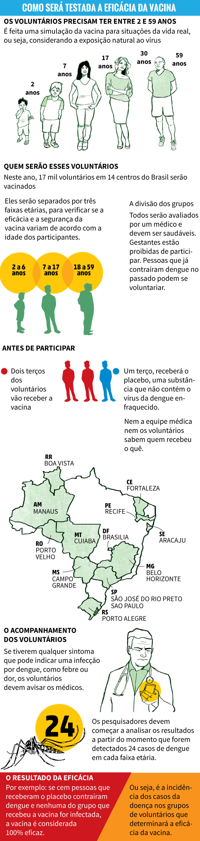 Essa etapa dos estudos comprova a eficácia da vacina em proteger contra a dengue. Pelo Brasil, 14 centros clínicos vão realizar os testes e aplicar a imunização em 17 mil voluntários. A expectativa é que a vacina esteja disponível para a população em 2018.