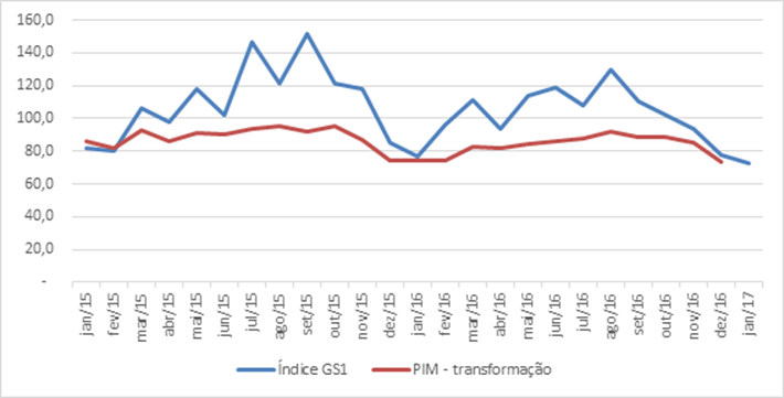 O Índice GS1 é o primeiro indicador antecedente de atividade disponível para Janeiro de 2017 e traz pistas importantes sobre o desempenho da atividade industrial no início de 2017, após um fim de ano um pouco mais forte do que apontavam as estimativas de mercado. Se confirmada, a reversão de tendência na indústria em janeiro pode minar expectativas de recuperação mais contundente da economia brasileira já a partir do primeiro trimestre.