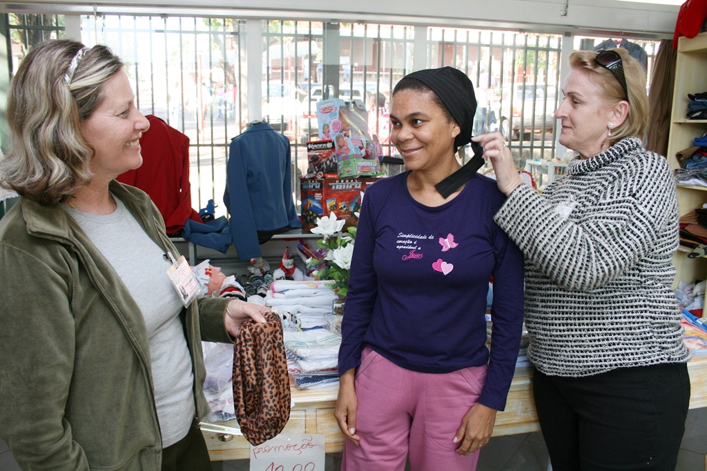 | As voluntárias Cleide Kato e Janete Ferri junto da paciente Genissi Batista de Oliveira, 38, de Presidente Epitácio, que experimentava as toucas do Bazar Permanente no Hospital Amaral Carvalho. A renda do local é utilizada pela Entidade Anna Marcelina para ajudar os pacientes carentes. "O trabalho delas é ótimo. Sem este tipo de serviço muitas pessoas não teriam condições de continuar o tratamento. Eu também utilizo o serviço das voluntárias. Sempre que venho cedinho tomo o café-da-manhã que é oferecido por aqui", diz Genissi |