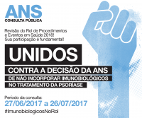 Inconformada com a negação da Agência Nacional de Saúde Suplementar (ANS) de incluir os tratamentos com imunobiológicos aos pacientes de psoríase grave ou àqueles cujas terapias tradicionais já não respondem mais ao tratamento da doença na Consulta Pública nº 61 do Rol de Procedimentos e Eventos em Saúde, a Associação Nacional Psoríase Brasil promove campanha em suas redes sociais e chama pacientes e sociedade para pressionarem contra a decisão da ANS. A organização sem fins lucrativos, que reúne as associações nacionais de pacientes com psoríase e tem sede no Rio Grande do Sul, considera um descaso e infundada a decisão da ANS. Como justificativa de não incorporação dos imunobiológicos na Consulta Pública, a ANS argumenta que não possui evidências suficientes à eficácia para incorporação de medicamentos de alto custo, como são os imunobiológicos quando comparados aos tratamentos tradicionais oferecidos pelos planos de saúde suplementar aos pacientes com psoríase.