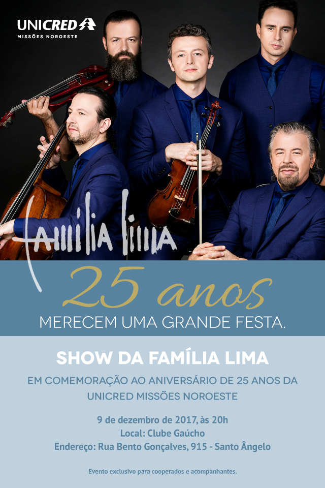 “Mais que uma data, um marco na cooperação e no desenvolvimento da nossa região“. Com estas palavras, o presidente da Unicred Missões Noroeste, Dr. Pedro Paulo Bottom Moro, define muito bem a importância do evento que ocorrerá no próximo dia 9, às 20h, no Clube Gaúcho, em Santo Ângelo. A cooperativa, que compreende as regiões das Missões e Noroeste do Estado, está completando 25 anos de existência. A festa, exclusiva para cooperados terá um show especial da Família Lima.