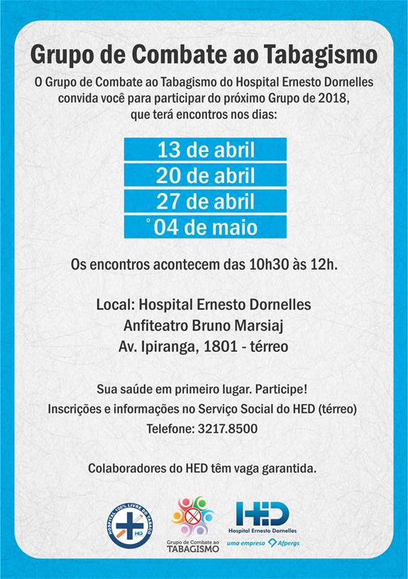 No dia 13 de abril, o Grupo de Combate ao Tabagismo do Hospital Ernesto Dornelles inicia mais um ciclo de encontros. As próximas reuniões ocorrem nos dias 20 e 27 de abril e 04 de maio, sempre das 10h30 às 12h, no Anfiteatro Bruno Marsiaj (Av. Ipiranga, 1801, Térreo – Porto Alegre).