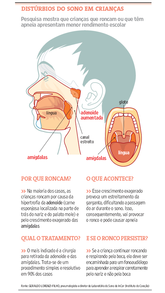 Segundo o pneumologista Geraldo Lorenzi-Filho, diretor do Laboratório do Sono do InCor (Instituto do Coração de São Paulo), o crescimento da adenoide e das amígdalas normalmente acontece junto e provoca um estreitamento da garganta, dificultando a passagem do ar e causando o ronco.