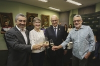 Legenda da foto: Presidente da Unicred Porto Alegre, dr. José Cesar Boeira ; diretora da FAMED, Lucia Maria Kliemann, o reitor da UFRGS, Rui Vicente Oppermann; e o vice-presidente da Unicred, João Vicente Bassols.