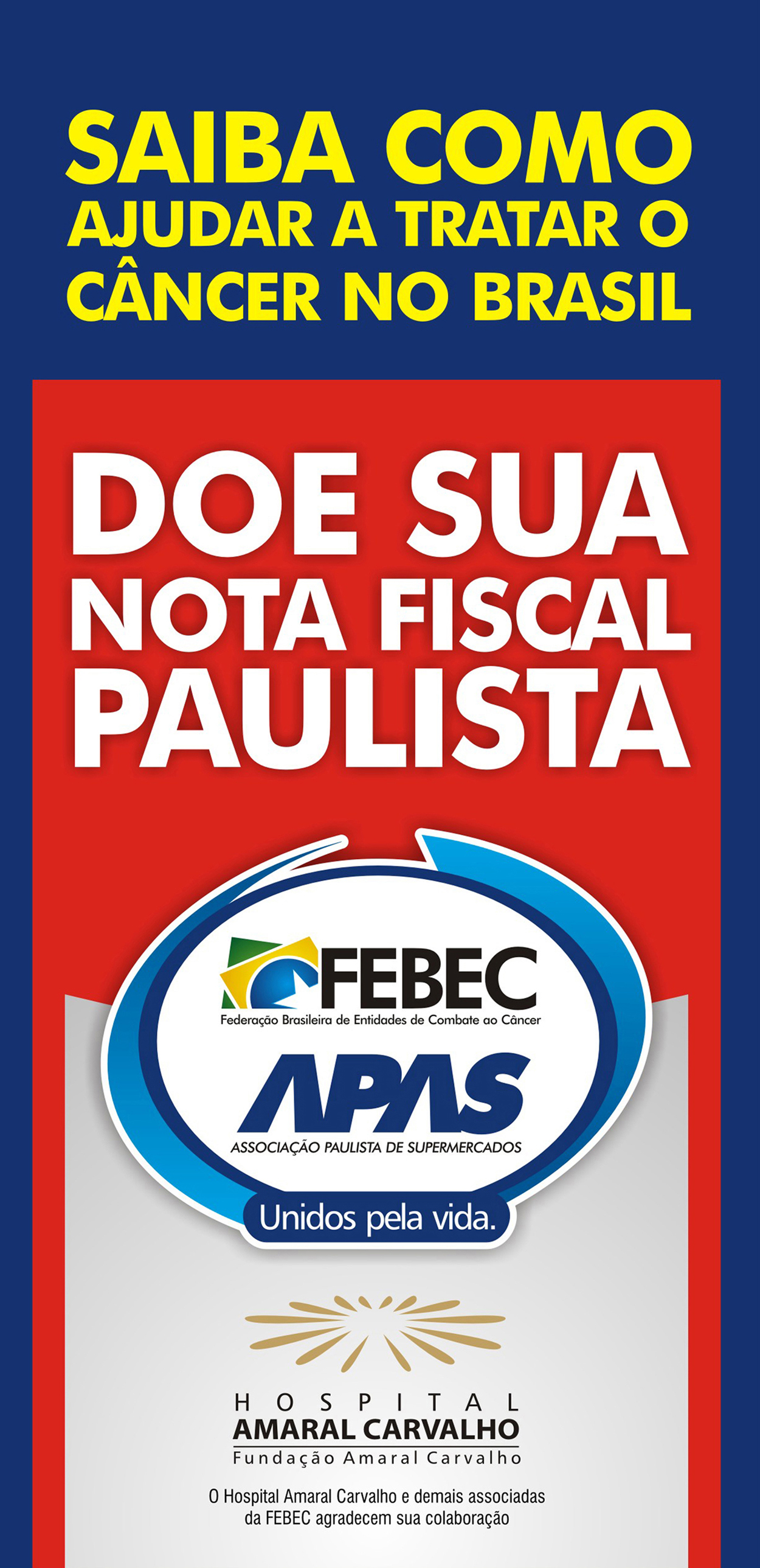 A Federação Brasileira das Entidades de Combate ao Câncer inicia no dia 1º de novembro campanha para arrecadar fundos por meio da Nota Fiscal Paulista. Agora o consumidor que não incluir seu CPF na nota poderá depositá-la em uma das urnas devidamente identificadas em estabelecimentos comerciais e ajudar o Hospital Amaral Carvalho.