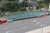 Terça, 26: bloqueio do passeio público em frente à Casa Magnabosco, na Sinimbu, para montagem do palco. A calçada ficará com espaço reduzido para circulação conforme o andamento dos trabalhos.