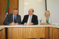 O secretário Estadual da Saúde, Osmar Terra e a secretária adjunta, Arita Bergmann, assinaram termos de compromisso com três prefeituras e três hospitais gaúchos na tarde desta quinta-feira (7/1) para repasses de verbas visando a reformas, compra de ambulâncias, veículos e equipamentos.