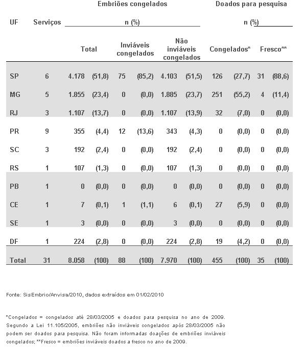 O relatório aponta ainda que 490 embriões foram doados para pesquisa, sendo que 93% deles foram congelados até 28 de março de 2005. Nesse caso, Minas Gerais foi o estado campeão: doou 255 embriões no total.
