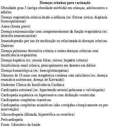 As grávidas e as crianças pequenas também entram no grupo de risco em razão de recomendações da OMS (Organização Mundial da Saúde) e com base na observação da morbidade da doença no seu primeiro ano --2009. No Brasil, pelo menos 156 gestantes morreram.