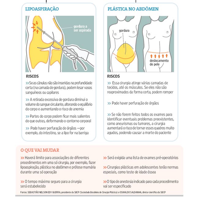A SBCP (Sociedade Brasileira de Cirurgia Plástica) prepara um documento com novas normas de segurança para o paciente. Entre as principais mudanças estão a limitação de número de procedimentos em uma só cirurgia; a definição de exames a serem exigidos antes da operação; as restrições para a cirurgia em adolescentes e a especificação do tipo de anestesia para cada caso.