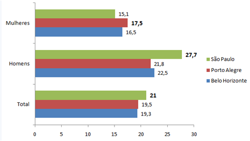 De acordo com o gráfico, podemos perceber que as capitais com a maior proporção de fumantes são, nesta ordem: São Paulo (SP), Porto Alegre (RS) e Belo Horizonte (MG). Porto Alegre se destaca, juntamente com a cidade de Rio Branco (AC), por apresentar liderança no ranking de tabagistas do sexo feminino. São Paulo (SP) apresenta um índice expressivamente superior de fumantes do sexo masculino em relação as demais capitais, o que, provavelmente, lhe conferiu a posição de liderança no ranking.