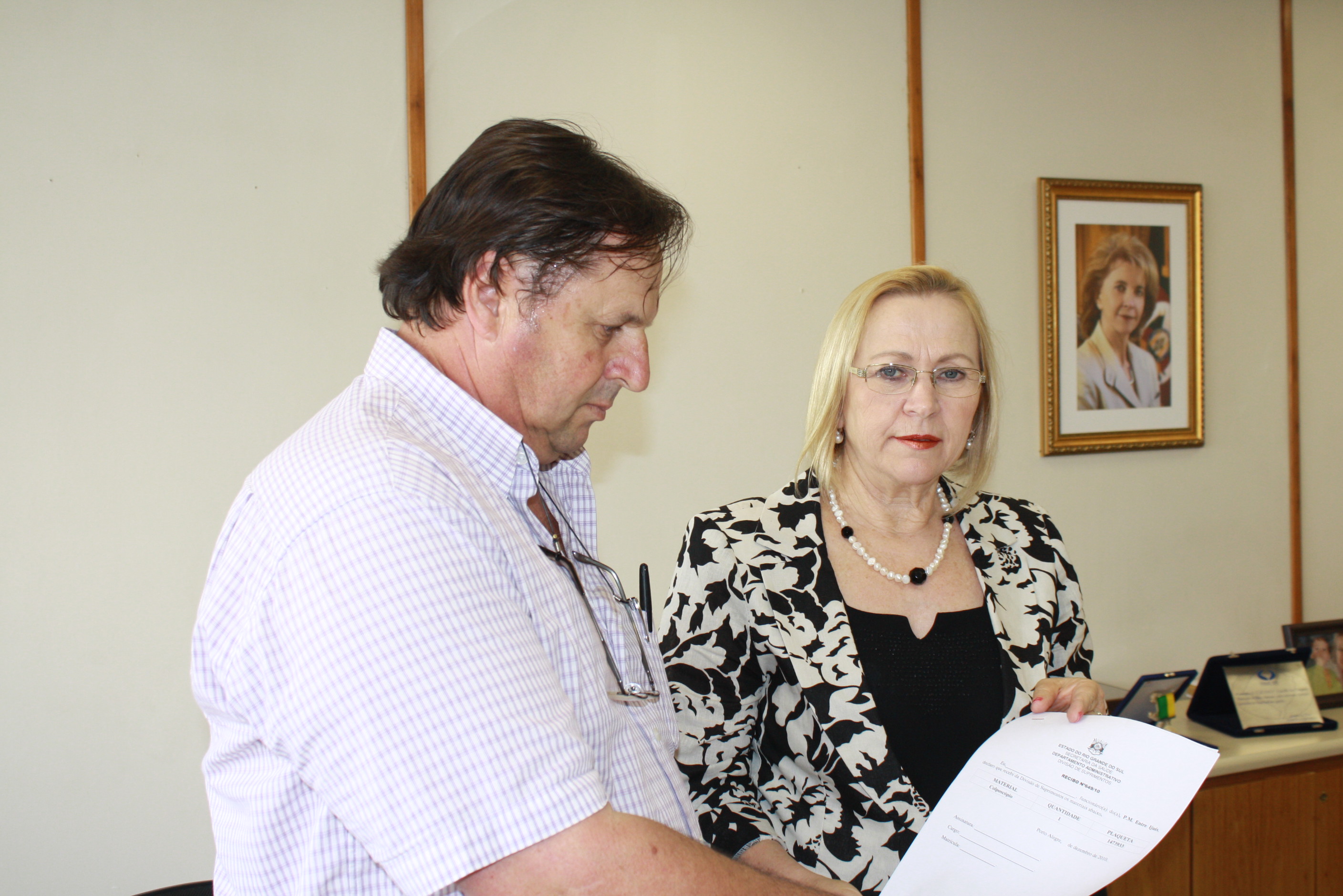 Secretária Arita Bergmann entrega termo de cessão de uso de um colposcópio ao prefeito de Entre-Ijuís, José Paulo Meneghine.