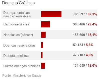 Dados do Ministério da Saúde divulgados nesta terça-feira (14) mostram que as mortes causadas por doenças crônicas caíram 17% no Brasil, entre 1996 e 2007. No período, a cada 100 mil habitantes, o número de óbitos foi de 569 para 475. Mesmo com a redução, o grupo ainda é a principal causa de morte no país, com 67% do total - foram 705,5 mil vítimas só em 2007. Entre as patologias estão as doenças cardiovasculares, respiratórias crônicas, neoplasias e o diabetes.