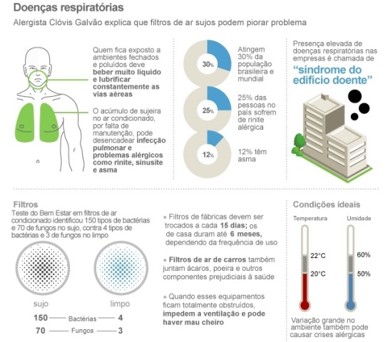 Segundo o otorrinolaringologista João Ferreira de Melo Júnior, do Hospital das Clínicas em São Paulo, os filtros do ar-condicionado – seja de casa, do trabalho ou do carro – devem ser trocados regularmente, de acordo com as orientações do fabricante.