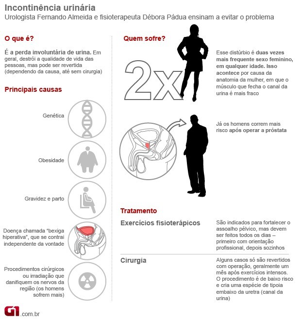 Segundo o ginecologista José Bento e a fisioterapeuta Débora Pádua, o distúrbio é mais comum no sexo feminino e atinge até 40% das mulheres acima dos 60 anos. Entre os homens, a doença ocorre principalmente após uma cirurgia de próstata.