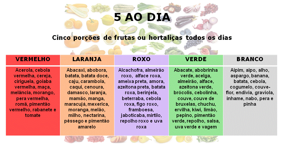 Como já mencionamos, a criança é um reflexo do ambiente a qual ela está exposta. Em primeiro lugar, o hábito da família deverá ser o exemplo saudável. De nada adianta os pais não darem exemplos saudáveis e quererem que estes façam parte da vida dos seus filhos. O exemplo vem do consumo da família, da oferta à criança, do exemplo dos pais e dos cuidadores. Na escola, o exemplo e a oferta dos alimentos são influenciados pelos colegas, mas o principal eixo, a base de formação alimentar da criança, vem de casa. Os pais querem ensinar aos filhos como se portar, quando e como devem executar tarefas, e a alimentação também fará parte desse legado. Quando a criança está exposta a um exemplo, tentará repetir para fazer parte do clã família. Em segundo lugar, vale salientar que existem políticas públicas de auxílio à alimentação saudável. A Estratégia Global de Alimentação, Atividade Física e Saúde, é uma iniciativa da Organização Mundial da Saúde (OMS) que vem com intuito de promoção de saúde e prevenção da obesidade e de outras doenças crônicas ligadas à alimentação. Entre as recomendações da Estratégia Global, o incentivo ao consumo de frutas, verduras e legumes (FLV) tem sido priorizado. Relaciona que o aumento do consumo desses alimentos diminui o consumo dos alimentos ricos em gorduras e açúcares, fornecem vitaminas, minerais e fibras, contribuindo para a regulação do peso corporal. O Programa “5 ao Dia” , criado em 1991, nos Estados Unidos da América, é uma realidade em mais de 30 países, dentre eles, o Brasil; e tem o objetivo de incentivar o consumo diário de pelo menos cinco porções de frutas, verduras e legumes. A tabela ilustrativa proposta, que traz a distribuição dos alimentos em cinco colunas de cores diferenciadas, torna-se uma ferramenta lúdica e divertida para estimular as crianças a esse consumo saudável. A distribuição das cores varia conforme a oferta de nutrientes dos alimentos.