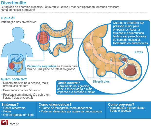 Com o envelhecimento, aparecem os divertículos, pequenos “saquinhos” que se formam para fora de uma parte do intestino grosso. Pode não acontecer nada com eles, mas existem casos em que eles inflamam, provocando a diverticulite. Geralmente, pessoas mais idosas ou que não têm o costume de ingerir fibras, frutas e verduras têm mais divertículos e, consequentemente, correm mais risco de desenvolver essa inflamação.
