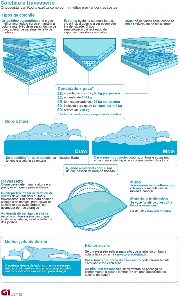 É preciso prestar atenção também ao tipo do travesseiro, que são os maiores responsáveis pelo torcicolo, um espasmo muscular causado por erro postural. O problema pode ser tratado com um relaxante muscular apenas, mas existem casos que precisam de massagem, fisioterapia e até o uso do colar cervical. A dica para se proteger é não usar o travesseiro muito alto ou muito baixo.