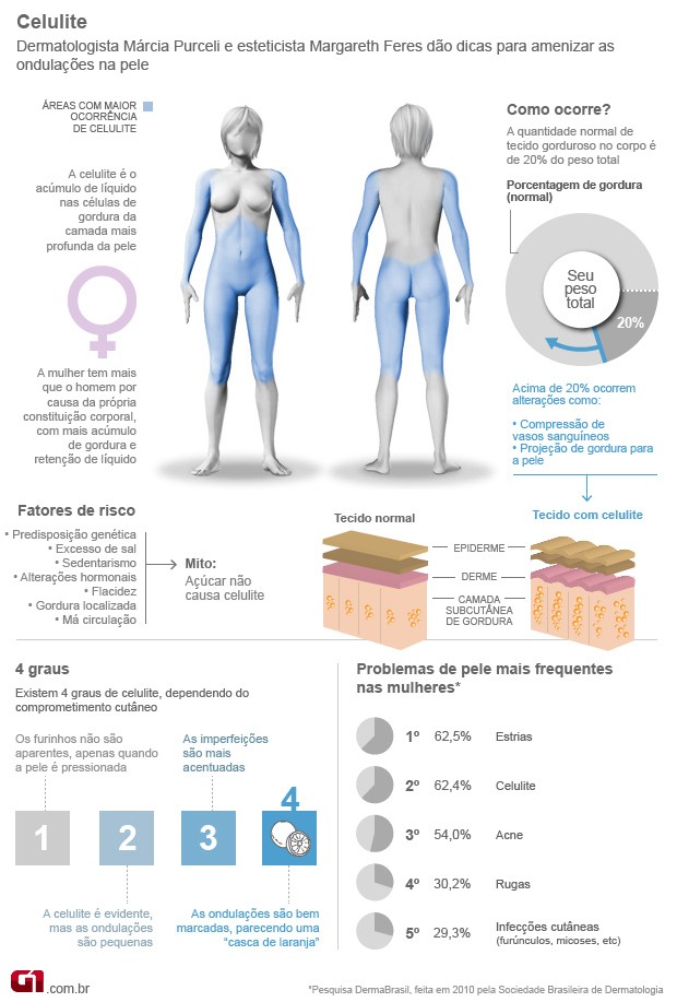 No caso das mulheres, existem alguns fatores que podem combater ou até evitar o surgimento da celulite, como a drenagem linfática, a boa alimentação, como lembrou o endocrinologista Alfredo Halpern, e a prática de exercícios físicos, principalmente para a região dos glúteos e coxas.