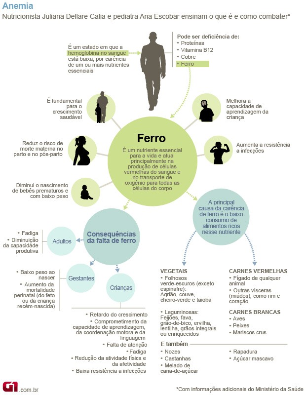 Como explicaram a pediatra Ana Escobar e a nutricionista Tânia Rodrigues no Bem Estar da última quarta-feira (23), o ferro é importante para a saúde porque, além de prevenir a anemia, funciona também como um combustível para que a hemoglobina, célula do sangue, transporte o oxigênio para todo o corpo.