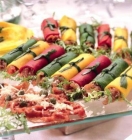 2. Corte a cebola, a cenoura e a abobrinha em palitos grossos e passe rapidamente por água fervente e, depois, por água fria.