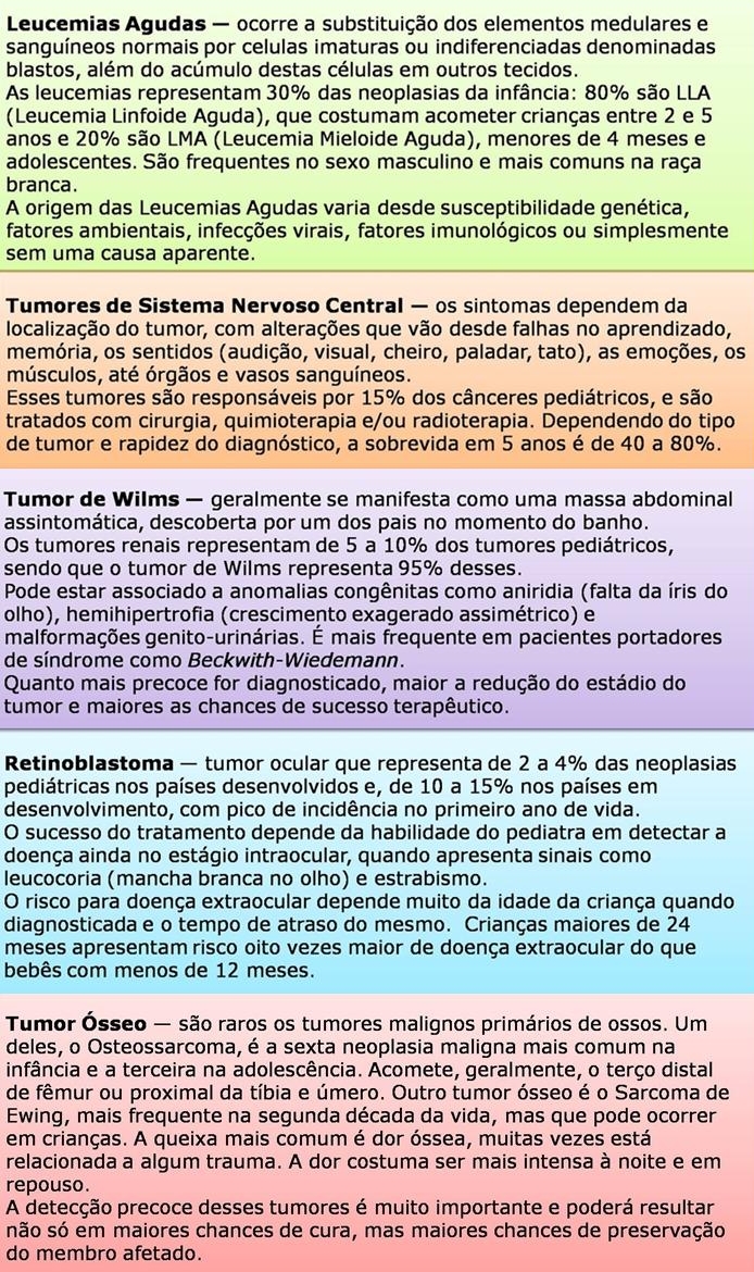 Claudia salienta que o câncer infantojuvenil - que se divide em diferentes tipos (veja quadro), não tem causa determinante. Trata-se de maior predisposição para desenvolver a doença. "São poucos os tumores infantis possíveis de prevenir, como é o caso do câncer de mama, por exemplo. Há formas de prevenção para o futuro: alimentação balanceada e hábitos saudáveis, entre outros, mas raramente ligadas ao câncer na infância."