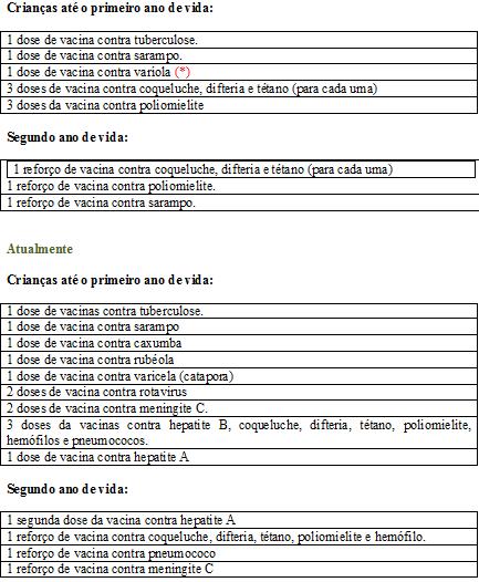 (*) A vacina contra varíola não consta mais do calendário de vacinações por ter sido esta doença extinta mundialmente, graças à imunização.