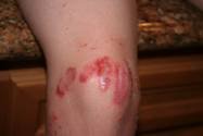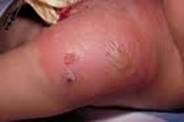 As duas primeiras fotos são de Impetigo bolhoso, no ombro e joelho, respectivamente. A terceira é um Impetigo comum no pescoço.