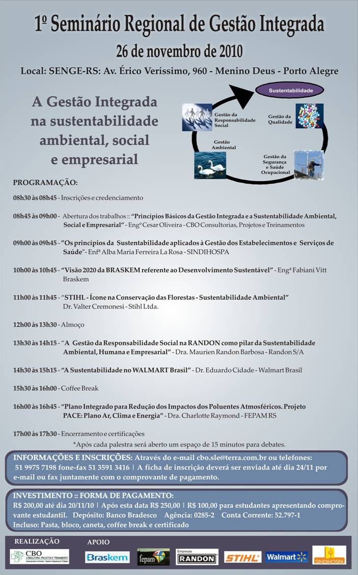 Evento é uma oportunidade rara de acesso às ferramentas básicas para implementação dos Processos de Gestão e para debater com especialistas e representantes de organizações expoentes a questão da Sustentabilidade, tais como FEPAM, BRASKEM, RANDON, STIHL, WALMART e SINDIHOSPA, além de formas, procedimentos, alternativas e benefícios dos processos de gestão com vistas à sustentabilidade ambiental, social e empresarial.