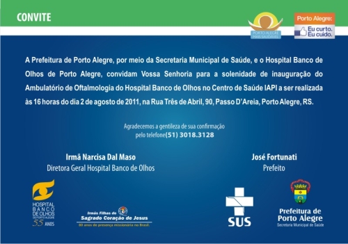 Com o propósito de ampliar o atendimento a pacientes provenientes do Sistema Único de Saúde (SUS), o Hospital Banco de Olhos de Porto Alegre inaugura no dia 02 de agosto, às 16h, o Ambulatório de Oftalmologia no Centro de Saúde do IAPI. Em conjunto com a Secretaria Municipal de Saúde, o Hospital irá disponibilizar consultas e exames através de agendamento prévio pelo SUS. O evento contará com as presenças do prefeito de Porto Alegre, José Fortunati, e do secretário de Saúde, Carlos Henrique Casartelli.