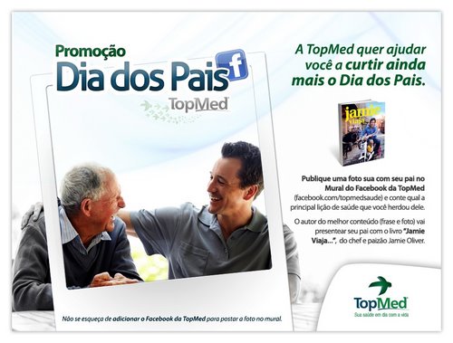 Líder nacional em promoção da Saúde e prevenção de riscos e doenças, a TopMed está com duas campanhas digitais “no ar”: uma voltada ao Dia Nacional da Saúde, comemorado em 5 de agosto, e outra com foco no Dia dos Pais. A intenção da campanha de Dia dos Pais, lançada esta semana no Facebook, é estimular os filhos a compartilharem a principal lição de saúde herdada de seus pais, além de proporcionar um espaço para homenagens públicas digitais. Para concorrer ao mais recente livro do chef e paizão de quatro crianças, Jamie Oliver, os participantes deverão postar, junto com a frase inscrita, uma foto sua com seu pai no Mural do facebook.com.br/topmedsaude.