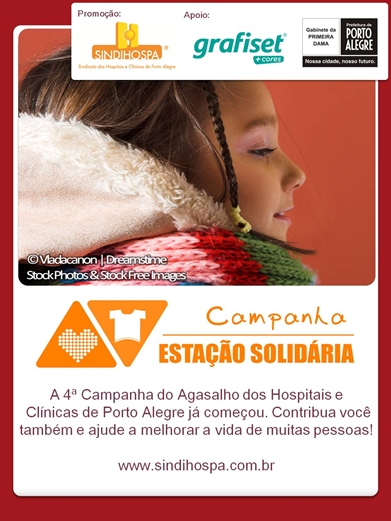 Sobre a Campanha Estação Solidária - Lançada há quatro anos, a campanha Estação Solidária mobiliza hospitais, clínicas e demais estabelecimentos de saúde para a doação de agasalhos. A logística coordenada pelo SINDIHOSPA compreende a distribuição de urnas coletoras junto às instituições de saúde que se uniram à campanha. Cada urna é identificada com um cartaz específico e, do mesmo modo, as instituições recebem folhetos para mobilizar não apenas o corpo de colaboradores, mas também pacientes e familiares. Ações via e-mail marketing também são promovidas, com vistas à sensibilização para a arrecadação, cada vez maior, de agasalhos. Para saber mais sobre a Campanha Estação Solidária, clique aqui.