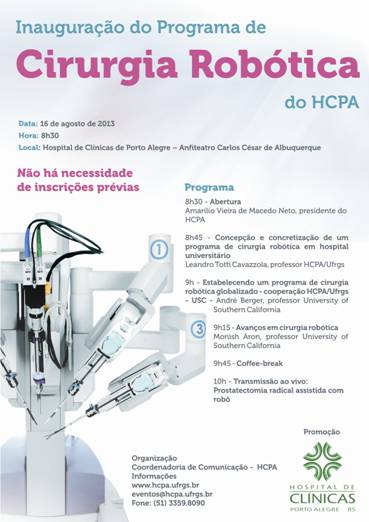 A primeira cirurgia do robô foi realizada no dia 9 de agosto, em um homem com câncer de próstata. Já a inauguração oficial do Programa de Cirurgia Robótica do HCPA será no dia 16 de agosto, a partir das 8h30, em evento (cartaz abaixo) que terá transmissão simultânea de cirurgia para o auditório do hospital e contará com a presença dos cirurgiões Monish Amon e André Berger, professores da University of Southern California. Amon executará a cirurgia a ser transmitida.