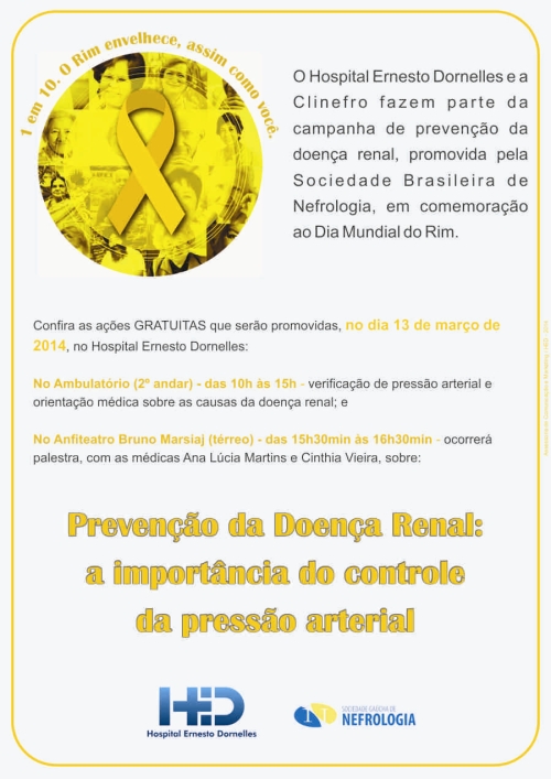 O Hospital Ernesto Dornelles em conjunto com a Clinefro apoiam a campanha do Dia Mundial do Rim, intitulada “1 em 10. O Rim envelhece, assim como você”, que é promovida pela Sociedade Brasileira de Nefrologia. No dia 13 de março, o Hospital fará uma série de ações preventivas. No Ambulatório do 2º andar do Hospital, haverá verificação de pressão arterial e orientação médica sobre as causas da doença renal, das 10h às 15h. Já no Anfiteatro Bruno Marsiaj, haverá uma palestra com as médicas Ana Lúcia Martins e Cínthia Vieira, das 15h30 às 16h30. As ações são gratuitas e não necessitam de inscrição prévia. Faz parte da campanha, também, uma iluminação diferenciada chamando a atenção da população para os cuidados com os rins.