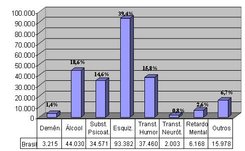 Dessas internações, conforme ilustra o gráfico abaixo, a segunda maior causa foi o abuso ou a dependência de álcool (18,6%), e a quarta maior causa foi em decorrência de abuso ou a dependência de outras substâncias psicoativas (14,6%). Somando-se esses percentuais, temos que o abuso ou a dependência de álcool e drogas representaram 33,2% das causas de internações no Brasil, no período entre janeiro a setembro de 2008. Do mesmo modo, observamos que, em primeiro lugar, encontrou-se a internação por transtornos do tipo esquizofrênico (39,4%); e, em terceiro lugar, as internações foram por transtornos do humor (15,8%).