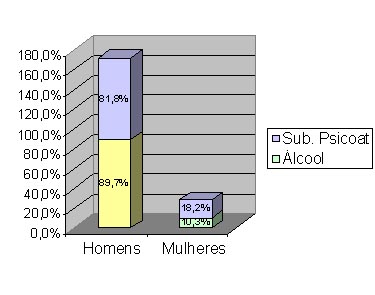 Em relação ao gênero, a análise do gráfico abaixo fornece dados objetivos, pois, a prevalência de internações por abuso ou dependência de álcool e substâncias psicoativas foi superior em homens (81,8% e 89,7%, respectivamente) que em mulheres (18,2% e 10,3%, respectivamente), no Brasil, para o período avaliado. Um estudo de base populacional, realizado no Brasil, indicou índices entre 8,4% e 19,9% de abuso e dependência de álcool entre homens, e 1,9 e 8,6% entre mulheres (BARROS et. al., 2007).