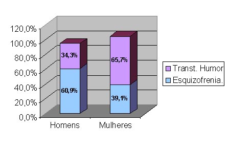 O gráfico 3, abaixo, revela que mais mulheres (65,7%) que homens (34,3%) foram internados por transtornos de humor, bem como mais homens (60,9%) que mulheres (39,1%) foram internados por transtornos do tipo esquizofrênico, para o Brasil, no período avaliado.